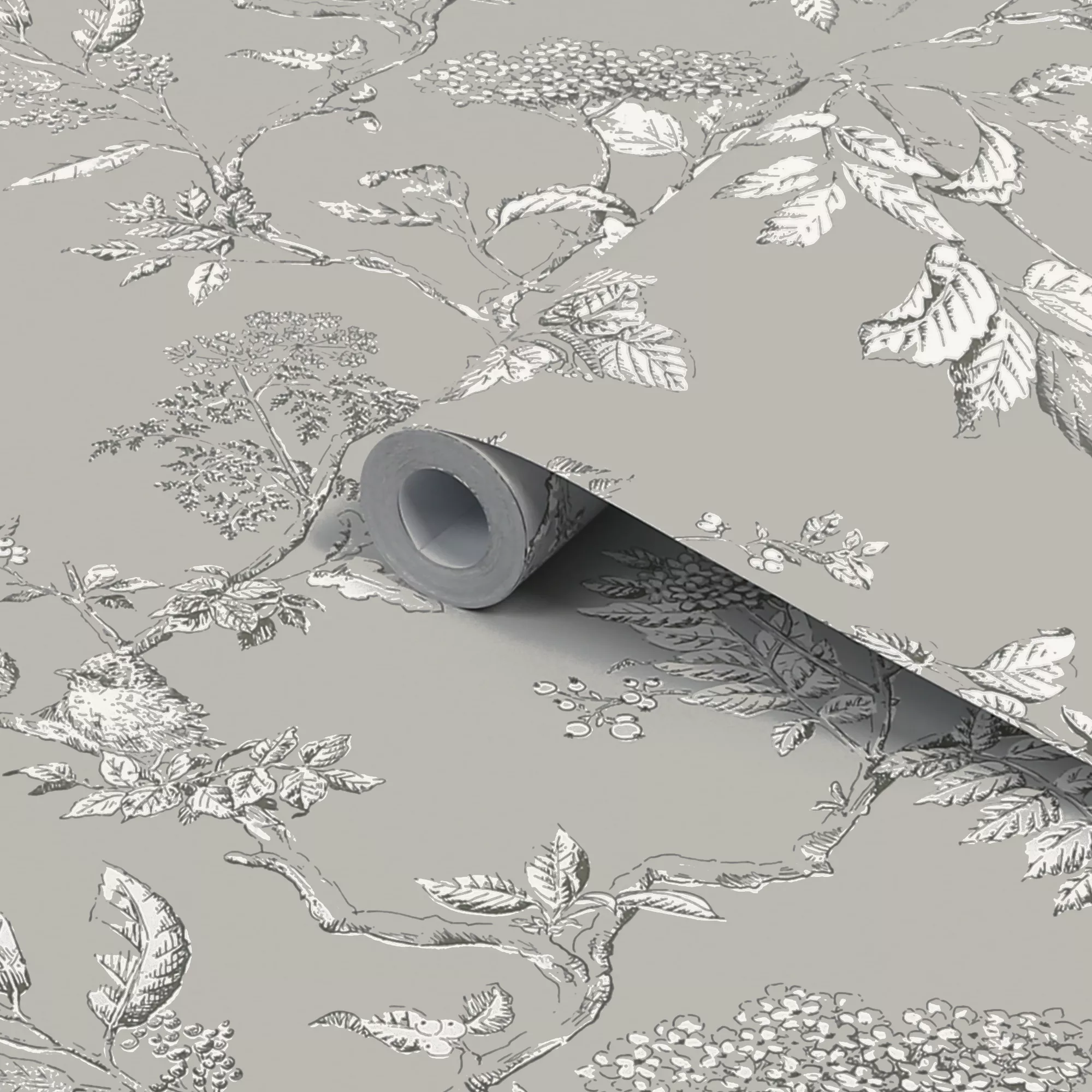 A contemporary twist to Laura Ashley’s heritage Elderwood design with hand drawn illustrative blossom and berries, set against a modern steel grey background.